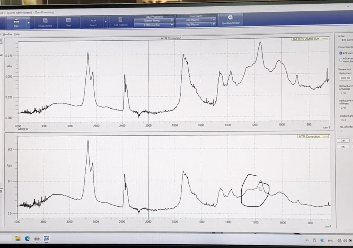 The laboratory uses advanced methods such as microscopic evaluation and infrared (FTIR) spectroscopy to analyze amber’s internal structure and chemical composition. One of the most important indicators experts look for is the “Baltic Shoulder” — a characteristic horizontal line (circled on), a signature in the spectrum that confirms the material is natural, unmodified Baltic amber.